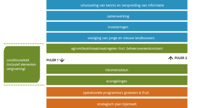 De volgende figuur toont een overzicht van de maatregelen in Vlaanderen die onder het strategisch plan vallen. Het gaat voor Pijler 1 om inkomenssteun en ecoregelingen, en om de sectorale maatregelen van de gemeenschappelijke marktordening (GMO) groenten en fruit en het bijenteeltprogramma. Voor Pijler 2 gaat het om steun voor agromilieuklimaatmaatregelen (AMKM), investeringen, de vestiging van jonge en nieuwe landbouwers, samenwerking en het uitwisselen van kennis en verspreiding van informatie. In het GLB 2023-2027 is er voor een belangrijk deel van de maatregelen een nieuwe definitie van de actieve landbouwer met als doel de steun meer te richten op de actieve landbouwers.
