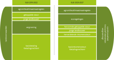 De volgende figuur toont de maatregelen die onder de nieuwe conditionaliteit vallen en maakt de vergelijking met het vorige GLB (periode 2015-2022). De conditionaliteit voor 2023-2027 waaraan landbouwers moeten voldoen is versterkt en omvat naast elementen van de randvoorwaarden en van een belangrijk deel van de vergroeningsmaatregelen uit de vorige periode, een aantal nieuwe elementen. Meer concreet bestaat de conditionaliteit uit een aantal normen voor goede landbouw- en milieuconditie (GLMC) op het gebied van klimaat, water, bodem, biodiversiteit en landschappen, en uit de beheerseisen voortvloeiend uit Europese wetgeving op het vlak van milieu, volksgezondheid, gezondheid van planten en dierenwelzijn.